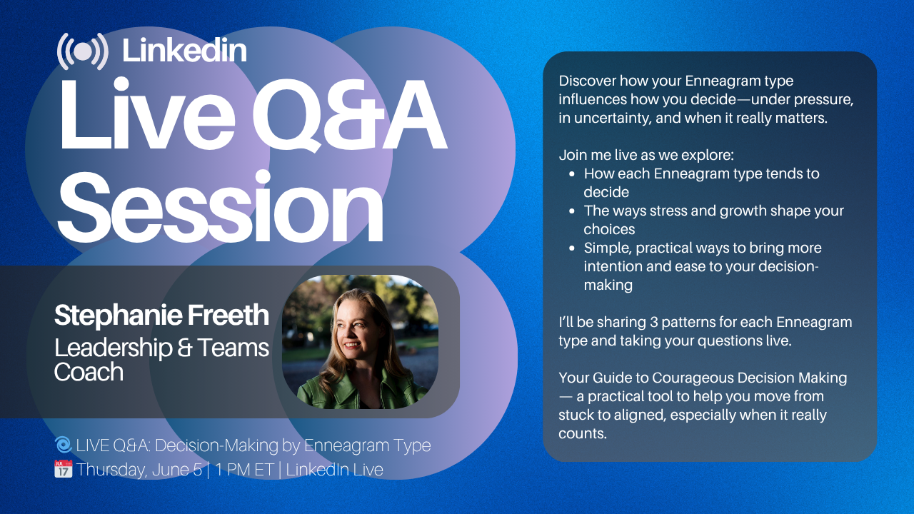 Meet Stephanie Blackburn Freeth: a trusted leadership coach and group facilitator with over 25 years of proven success. Combining strategic planning, team performance expertise, and mindset mastery tied to the Enneagram and conscious leadership, Stephanie brings a clear, compassionate, and outcome-focused approach that transforms leadership skills and builds resilient, drama-free organizational cultures — from the inside out.