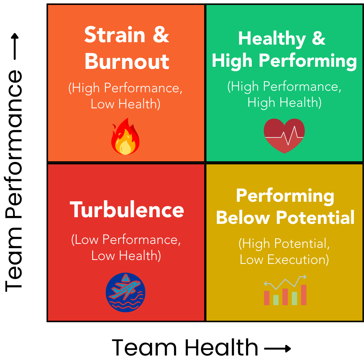 Strain & Burnout (High Performance, Low Health) Your team is getting results but at a cost. Signs include exhaustion, rising stress, or unresolved tensions. This zone is often misunderstood because performance can mask health risks that will eventually erode effectiveness.